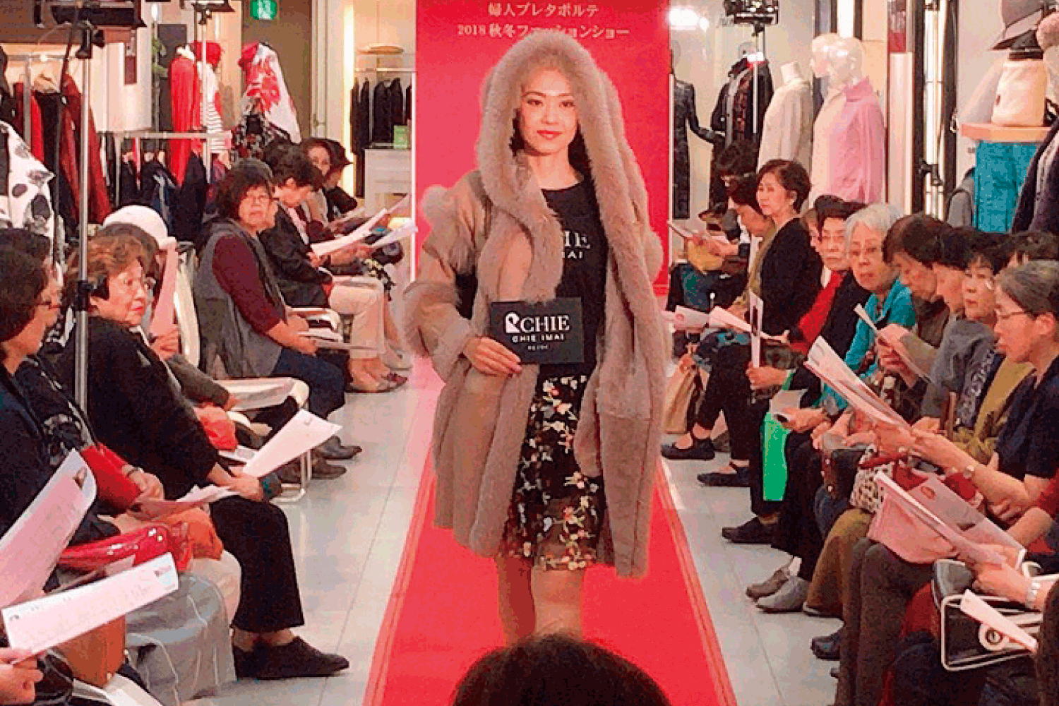 秋冬プレタポルテ【フロアショー】 2015年12月 実績・実例 毎年2回開催される恒例のフロアショー。お客様の手元には出展コスチュームの案内パンフレット。登場するモデルの手にはブランド名カード。照らし合わせ出来ると好評。